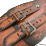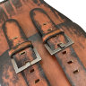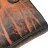 Он сделан из однослойной телячьей кожи. Хотя кожа достаточно толстая ( 1.8 - 2 мм), но очень мягкая и приятная на ощупь. Кожа стилизована под состаренную (ручная прокраска): эффект потертости и переход от темных к светлым тонам. Кожа обработана защитным составом и не боится влаги. Не пачкается и не пахнет.