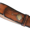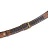 Задняя часть ремня украшена ручной перфорацией (орнамент из дырочек) и стилизованным металлом (покрытие «старая латунь»). Пряжка овальной формы ( по требованию может быть заменена на другие, стилистически подходящие модели). Покрытие пряжки и украшений – «старая латунь».