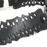 Изготовлен из однослойной телячьей кожи, достаточно толстой, но мягкой и эластичной. Декорирован ручной перфорацией: ажурный край и орнамент из дырочек.